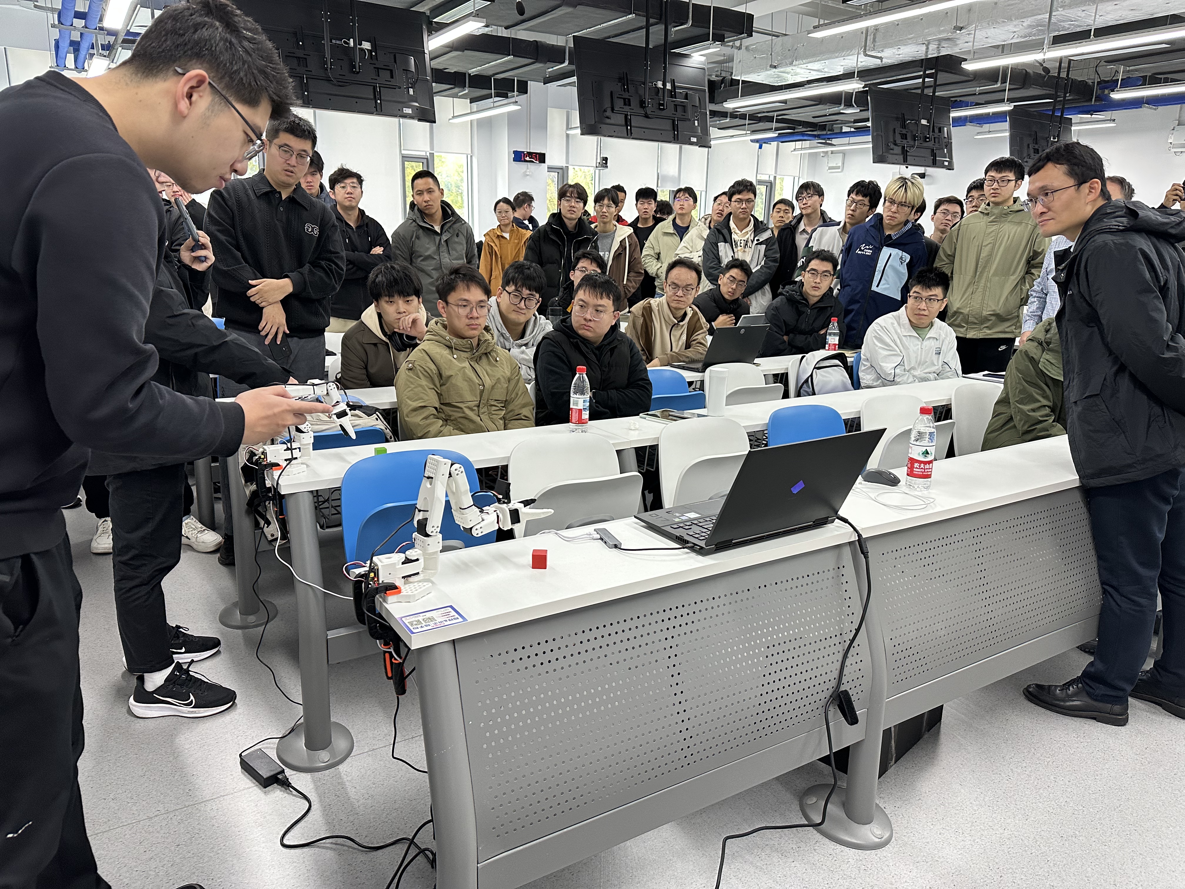 在核心技术解析环节,马晓光教授重点对比了具身智能、离身智能与传统智能的概念差异,进一步介绍具身智能机器人模仿学习的现状与痛点,指出当前模仿学习存在泛化能力弱、对复杂环境适应性差等问题,并针对性分享了三类创新解决方案。随后,马晓光教授的助教结合自身科研经历,补充介绍了具身智能科研机器人的研发进展、端到端的具身智能实现路径及情感具身智能机器人的应用场景,并现场演示机械手柄的操作逻辑,邀请在场同学近距离观看体验,让抽象的技术原理变得直观可感。